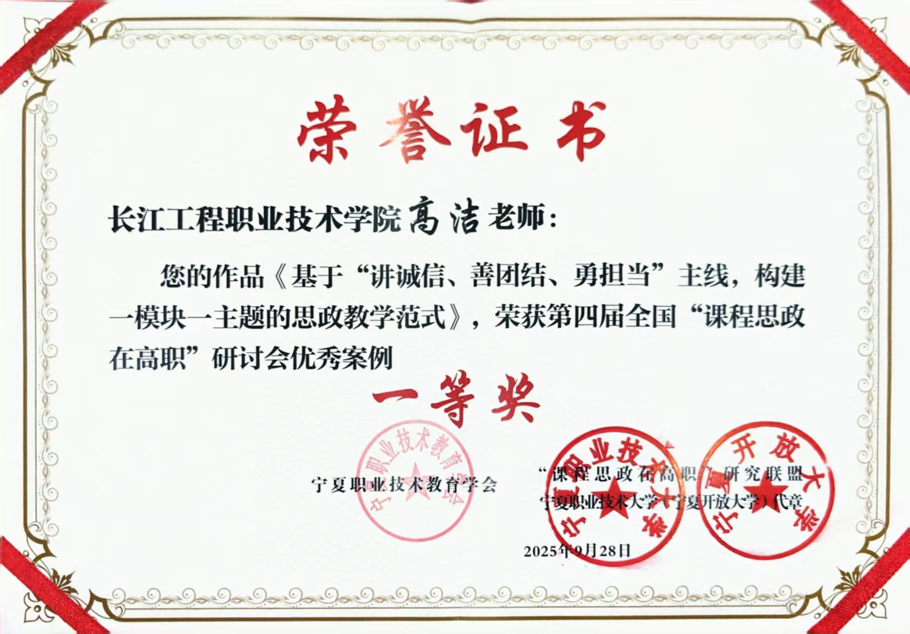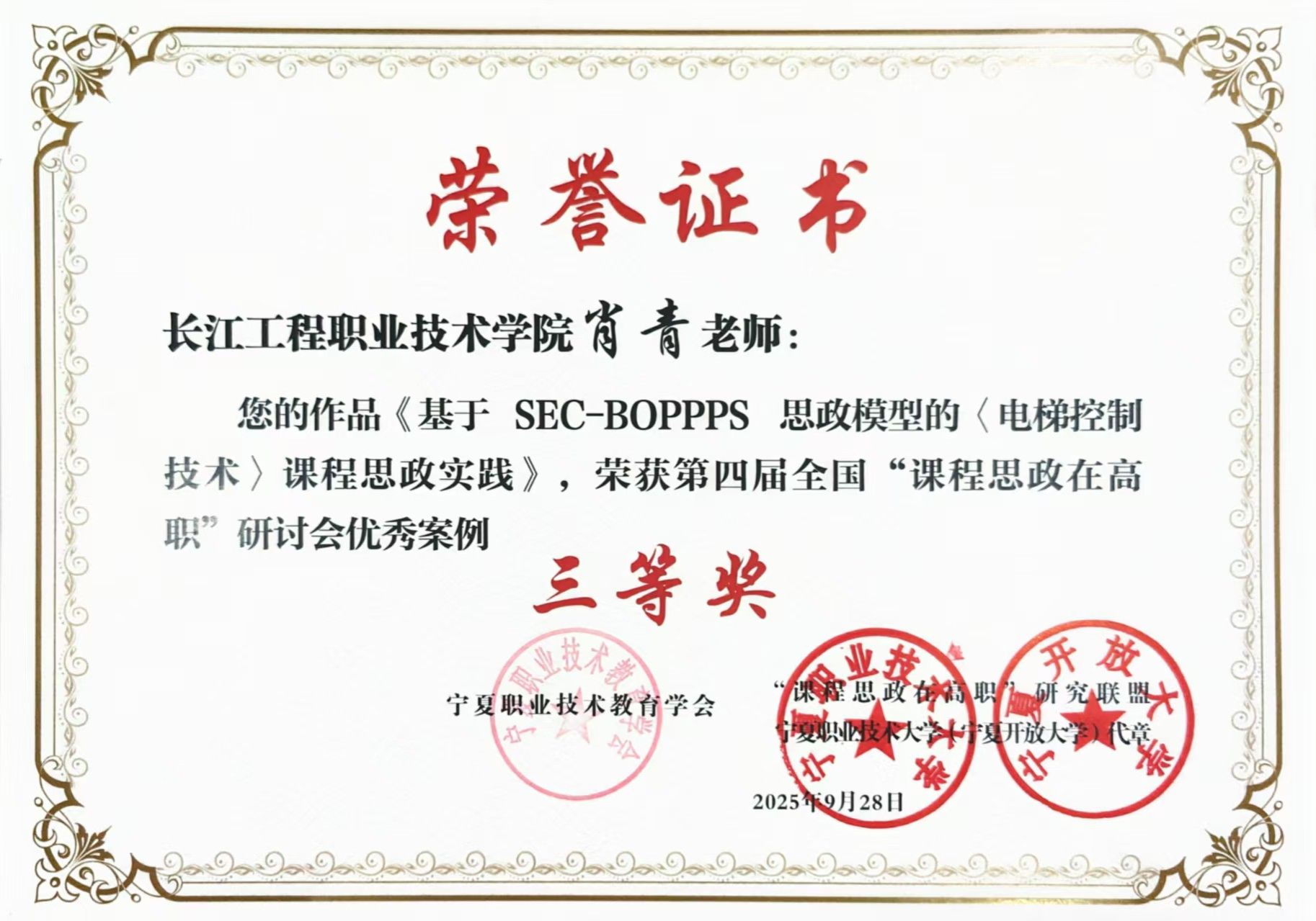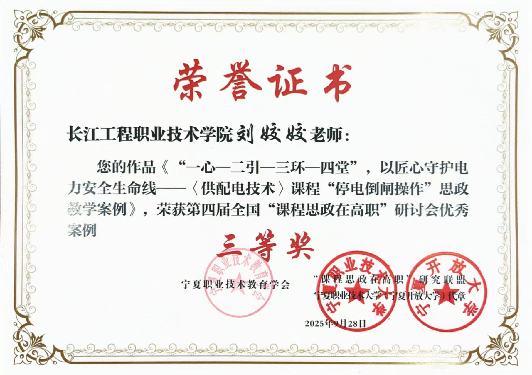 近日,第四届全国“课程思政在高职”研讨会课程思政教育微课及案例评选结果正式公布,我校报送的3项案例全部获奖。高洁老师的案例《基于“讲诚信、善团结、勇担当”主线,构建一模块一主题的思政教学范式》荣获优秀案例一等奖,肖青老师的案例《基于SEC-BOPPPS思政模型的<电梯控制技术>课程思政实践》以及刘姣姣老师的案例《“一心 二引 三环 四堂”,以匠心守护电力安全生命线—<供配电技术>课程“停电倒闸操作”思政教学案例》荣获优秀案例三等奖。此次获奖充分展现了我校在课程思政建设方面取得的显著成效,也是学校长期以来落实立德树人根本任务的有力体现。