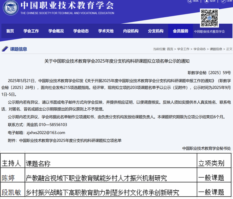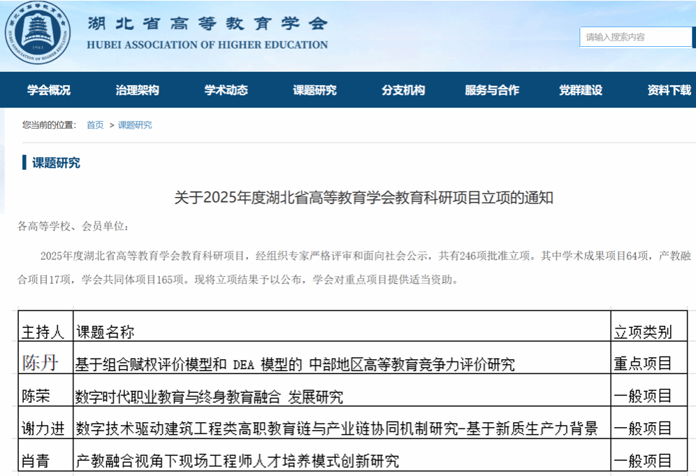 近日,中国职业技术教育学会、湖北省高等教育学会两大业内学术组织相继公布2025年立项课题名单,我校再次取得突破。