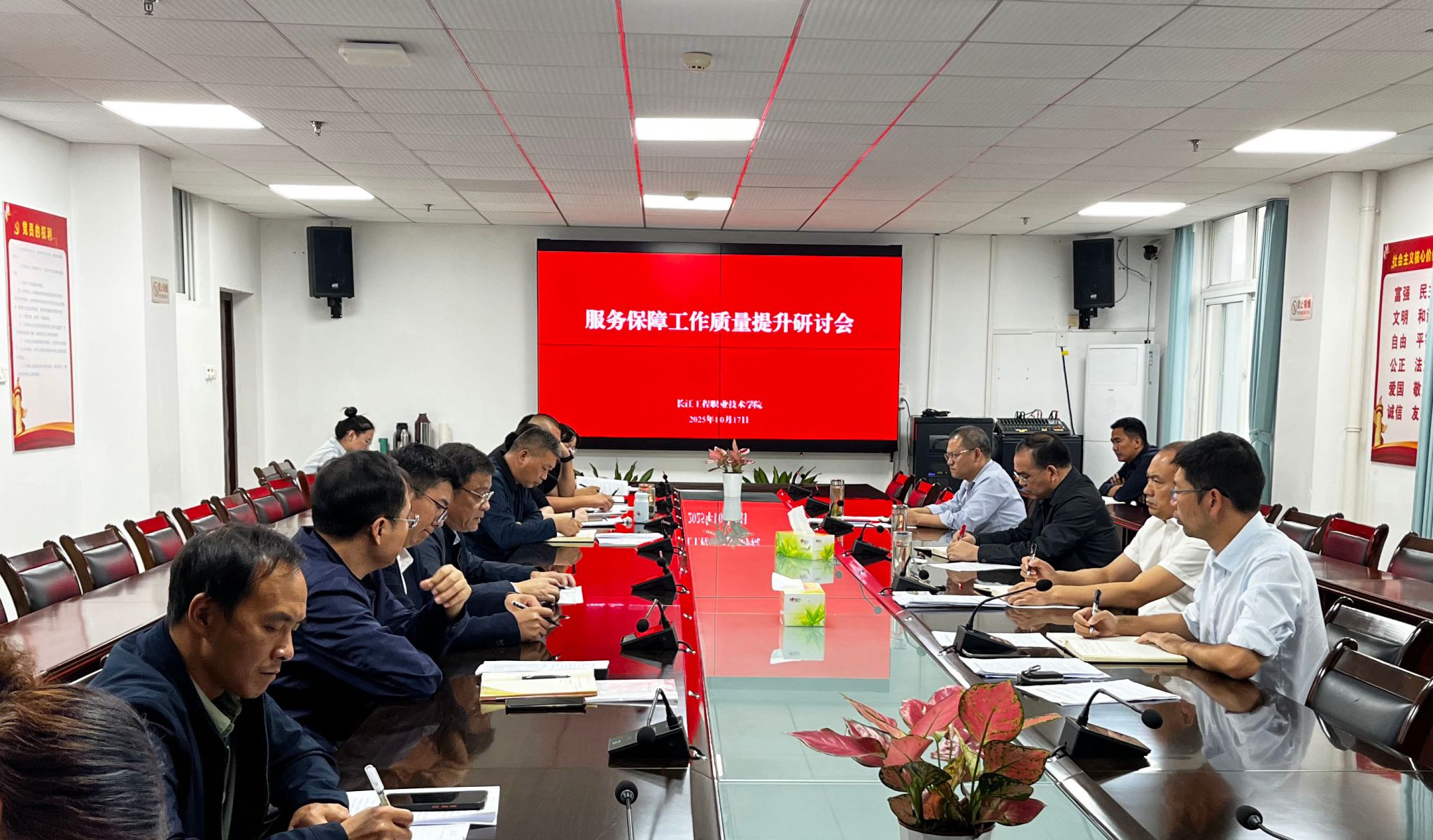 为给全体学生提供一个安全、整洁、和谐、温馨的校园环境,切实提升学校服务保障工作质量,10月17日,学校组织召开服务保障工作质量提升研讨会。校党委书记向家文,校长杨道远,驻校纪检监察组组长、党委委员、纪委书记刘合强,党委委员、副校长卢俊及纪委综合室、校办、财务处、审计处、学工部、保卫部、后勤处等部门主要负责同志参加会议。