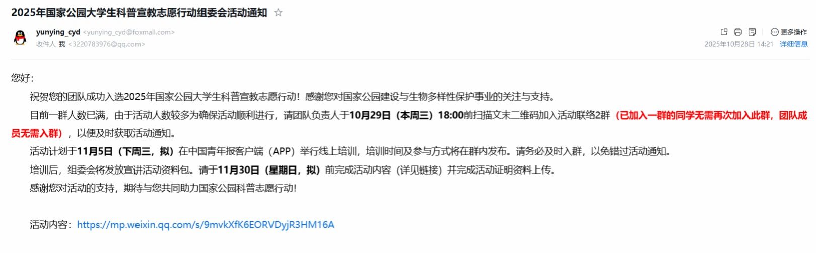 10月28日,2025年全国大学生国家公园科普宣教志愿宣讲团入选名单揭晓,我校人工智能学院“青铜树”志愿服务队凭借扎实的前期基础和优异的申报方案,成功再次入选。这是该团队继2024年入选后,连续第二年承担此项国家级志愿宣讲任务。