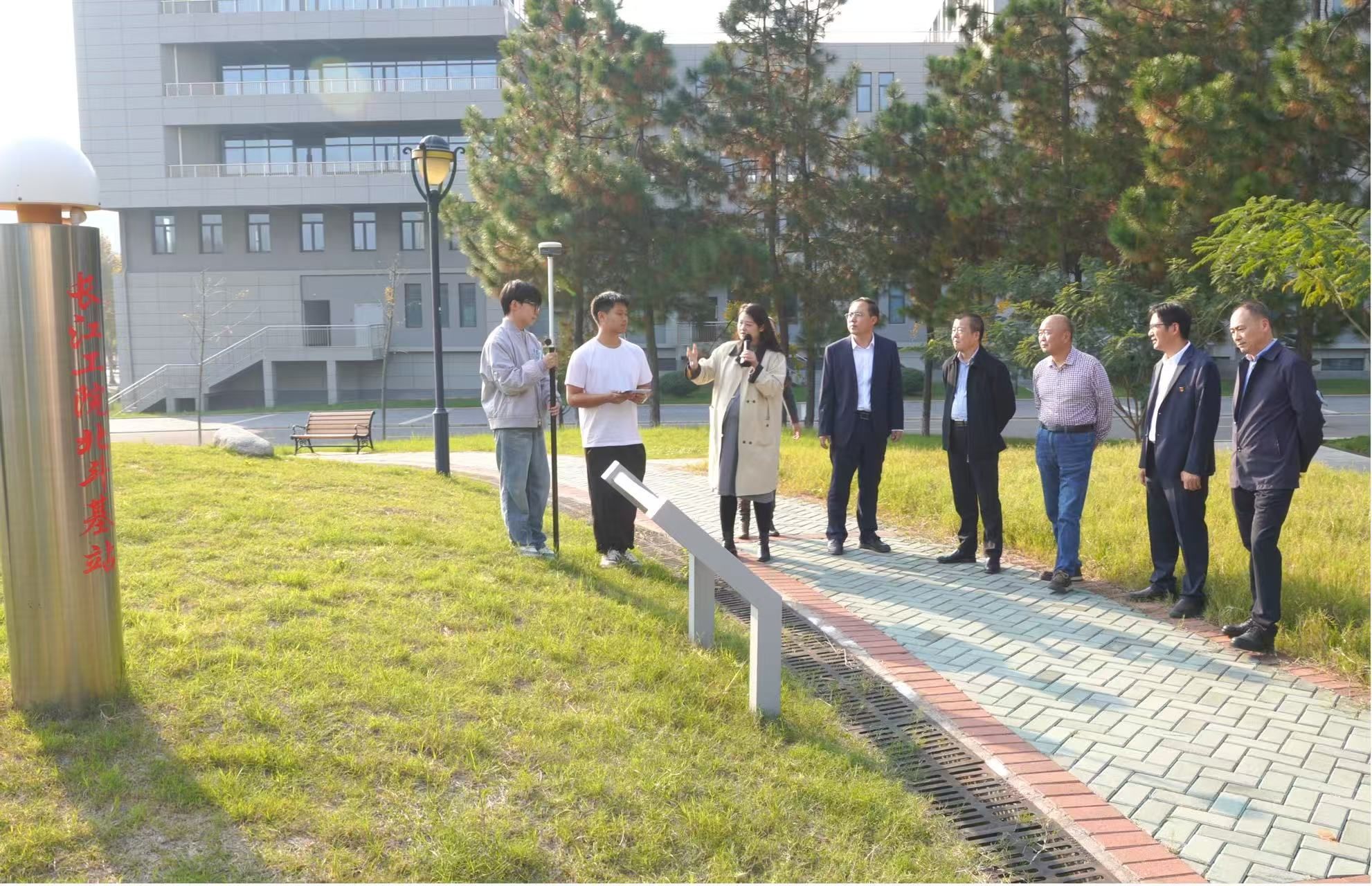 观摩团第二站来到了学校北斗卫星基准站,石娟娟老师介绍说:该基准站由学校自主建设,除为校内区域提供差分数据外,同时为学校周边地理信息企业和相关北斗终端提供数据服务。更为重要的是,基准站的建设和运维为培养测绘地理信息专业群学生在掌握北斗定位原理、学习基站安装调试、使用终端数据进行地理信息数据采集等方面提供有力支撑。