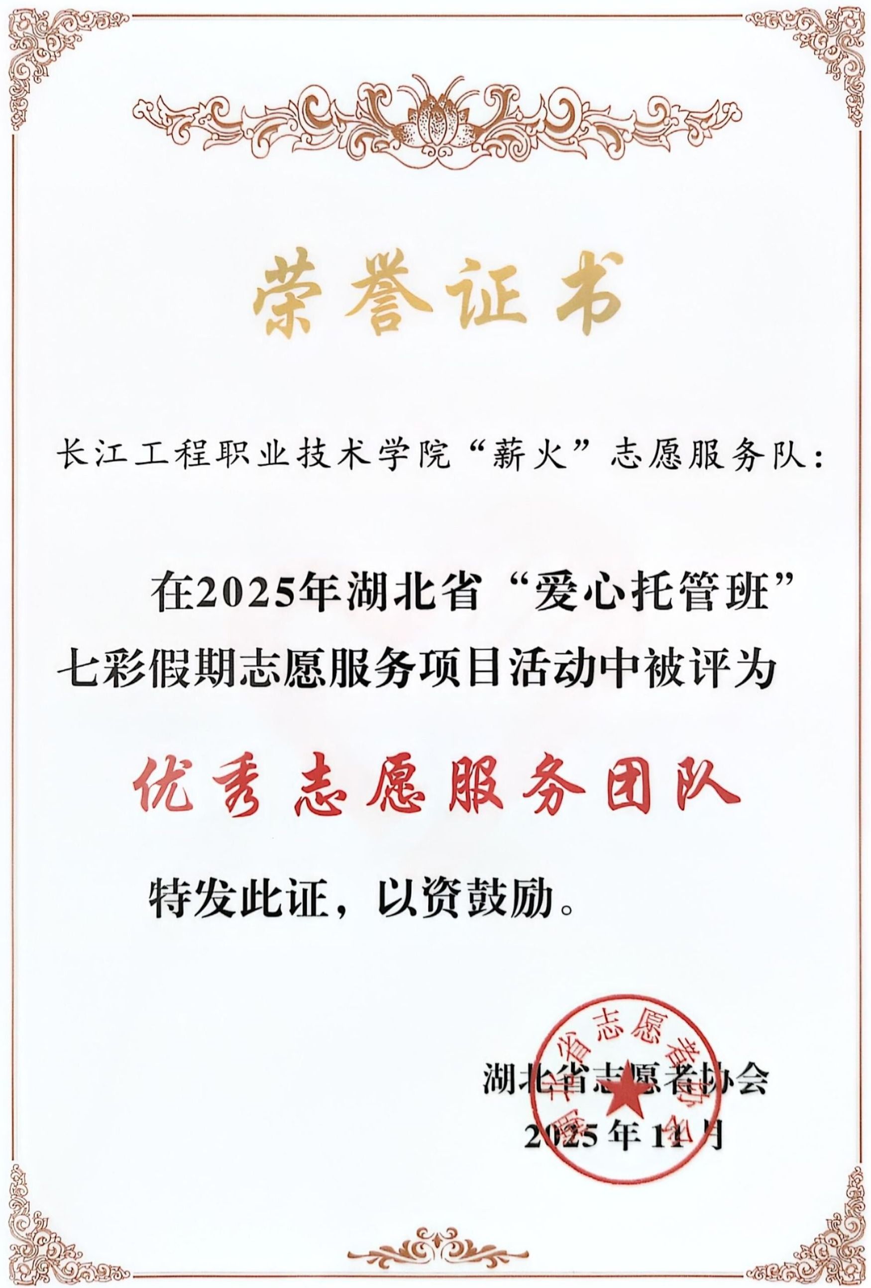 近日,湖北省青年志愿者协会公布2025年湖北省“爱心托管班”七彩假期志愿服务项目优秀团队名单,我校机电工程学院“薪火”志愿服务队获评“优秀志愿服务团队”荣誉称号。