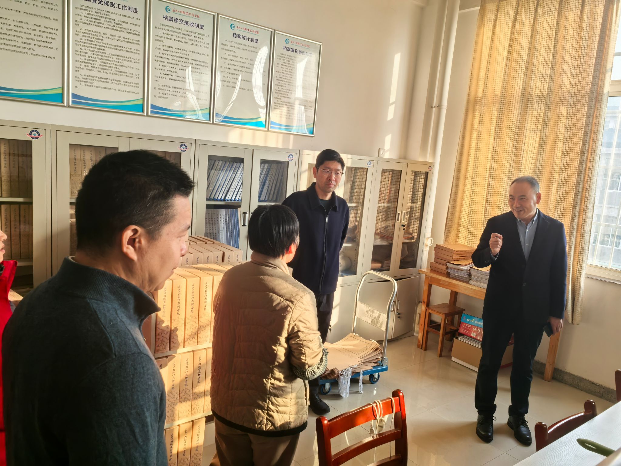 杨道远一行先后对保密室、广播台、档案馆、机房、图书馆、校园110指挥中心、配电房、危化品实训室、学生食堂、学生宿舍等地,进行了全面细致的安全检查。检查过程中,杨道远认真听取了关于安全责任落实、设施设备运行及日常管理维护等方面的工作汇报,详细询问了消防安全、用电安全、食品卫生安全、实训室安全等具体情况。在食堂,杨道远校长仔细了解食材采购、储存、加工流程以及餐具消毒等环节的管理措施,强调要始终将师生的健康安全放在首位,严把食品安全关。在学生宿舍,检查组重点查看了住宿环境、消防设施配备与应急通道畅通情况,要求不断加强学生的安全教育和住宿管理,叮嘱工作人员务必坚守岗位,确保校园基础保障设施安全稳定运行。 针对发现的隐患问题,杨道远现场明确整改要求、责任单位和完成时限,并对具体整改措施提出指导意见。