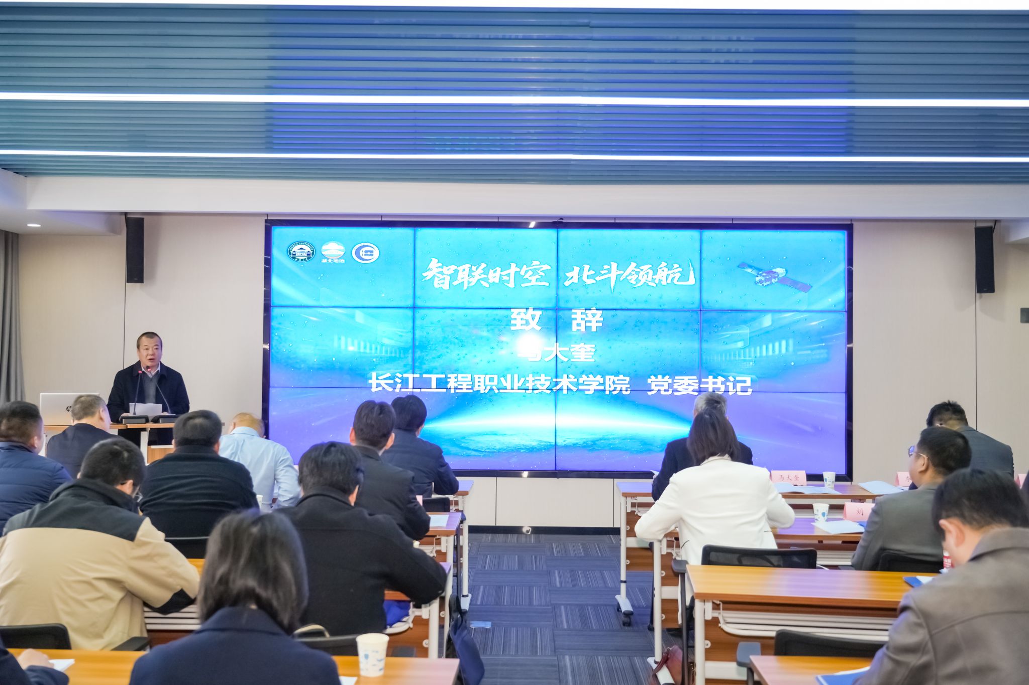 长江工程职业技术学院校长杨道远为新增加的副理事长单位、理事单位授牌。学校党委书记马大奎在致辞中强调,面对北斗应用产业蓬勃发展的机遇,共同体须以更高站位、更实举措推动建设迈上新台阶。他提出三点展望:一是强化育人载体,通过共建教学资源、实训基地、双师队伍等,实现人才培养与产业需求精准对接;二是搭建服务平台,建设产教供需对接数字化平台,推动“政行企校社”资源高效匹配与成果转化;三是完善合作机制,进一步优化运行、决策与利益共享机制,构建“资源共享、风险共担、成果共赢”的发展共同体。