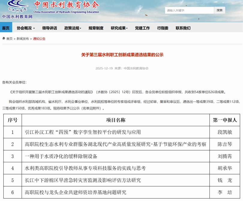 近日,中国水利教育协会公布第三届水利职工创新成果遴选结果。经过初审、复审和审议后,遴选出一等成果39项,二等成果112项,三等成果150项,优秀成果183项。来自9所水利类高职院校的37项成果上榜。我校6项成果在列,总数位居第三。