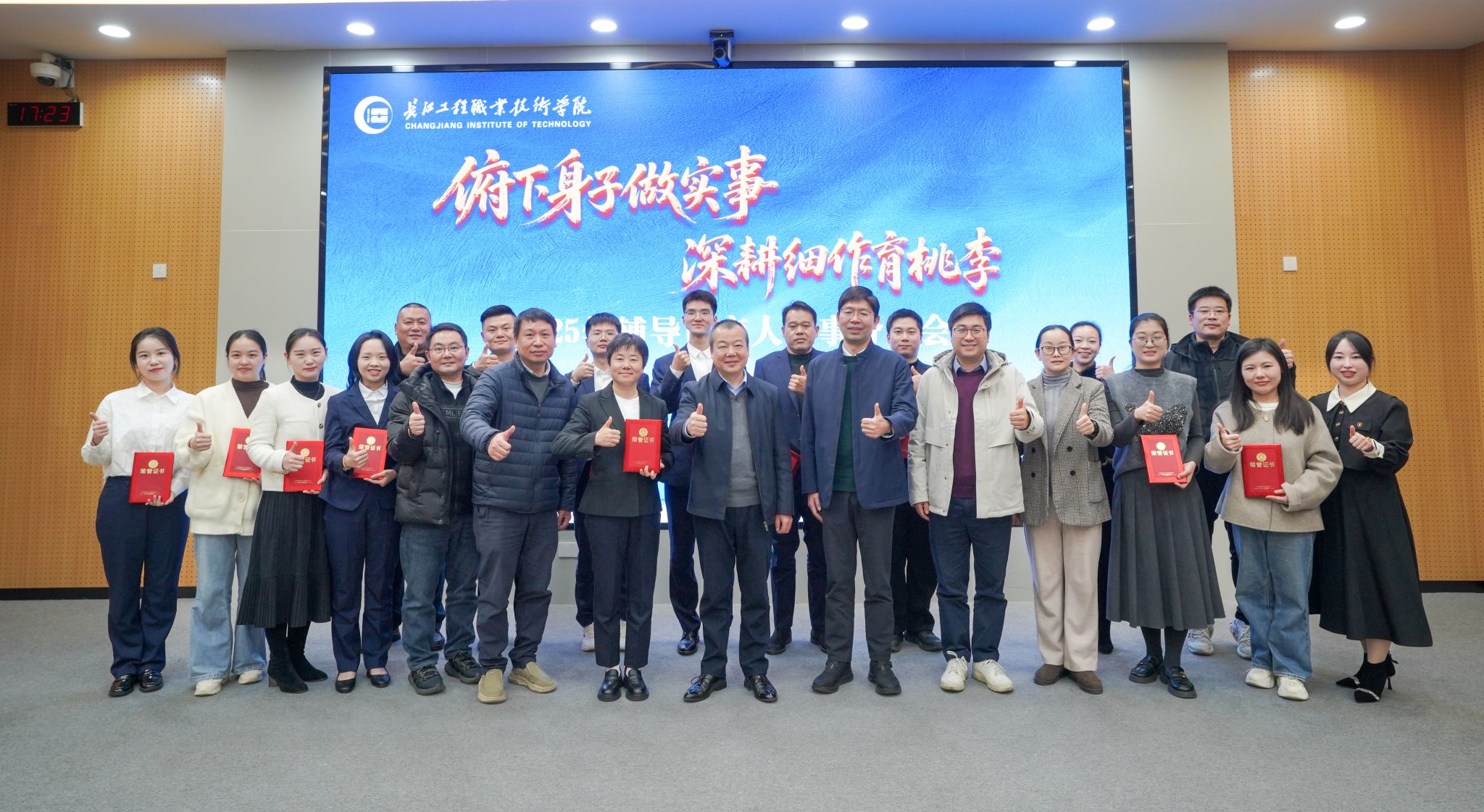 经过激烈角逐与公正评审,人工智能学院辅导员徐晓晖荣获一等奖;机电工程学院辅导员尹浩扬、北斗技术学院辅导员段春晓荣获二等奖;机电工程学院辅导员李亚竹,智能建造学院辅导员蔡晶、吴静,数字商贸学院张智颖荣获三等奖;其他参赛选手荣获优秀奖。马大奎、卢俊及评委团成员分别为获奖选手颁奖。