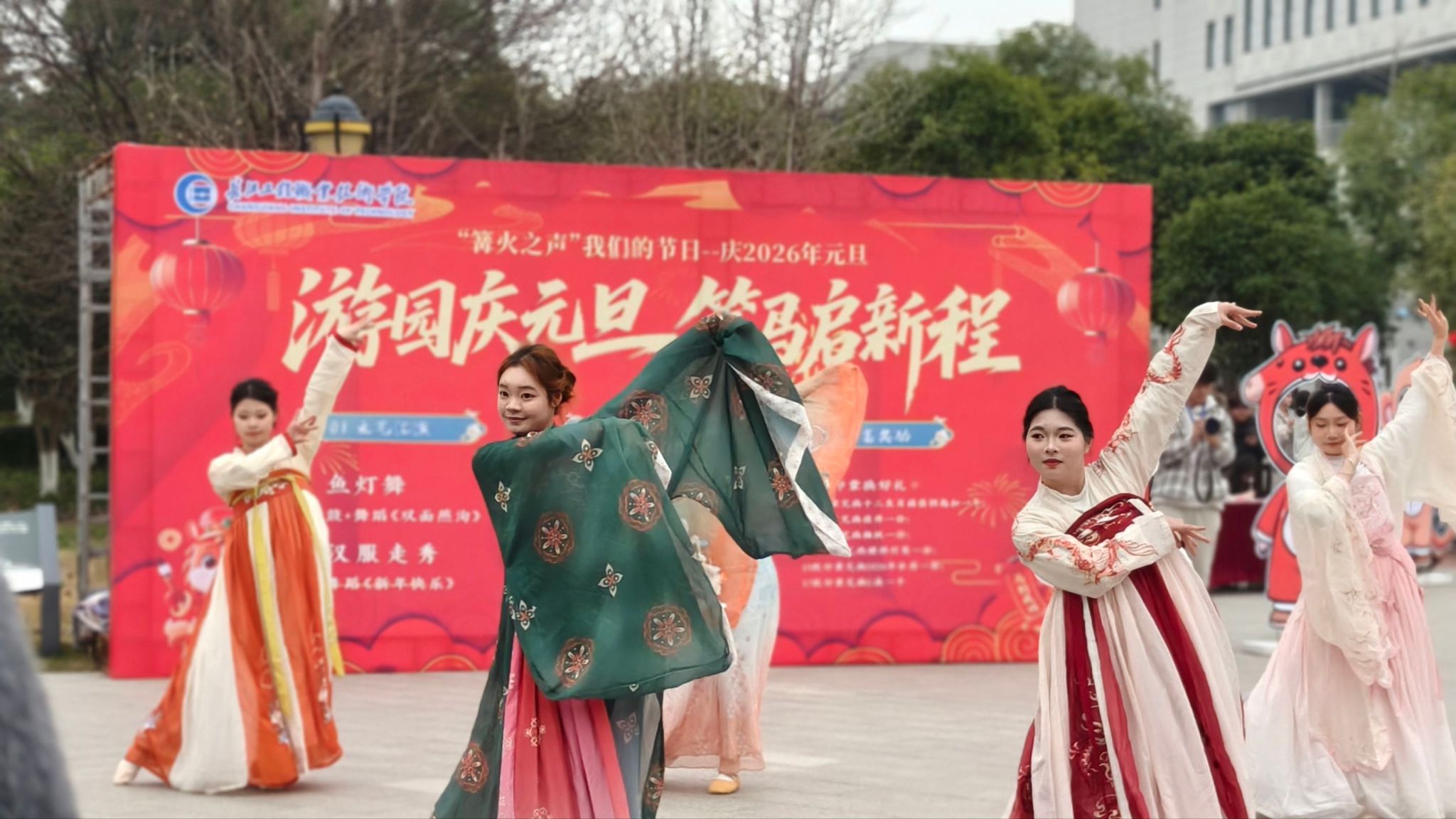灵动的鱼灯舞翩跹而至,光影交错间尽显传统民俗之美;鼓与舞蹈《双面燕洵》以刚劲鼓点搭配优美舞姿,刚柔并济的表演诠释着奋进力量;子衿国社的汉服走秀古韵盎然,身着各式汉服的学子款款走来,尽显中华服饰之美;群舞《新年快乐》活力四射,欢快的舞步点燃全场热情,老师与学生们一同挥舞双手,跟着节奏喝彩,纷纷拿出手机记录这欢乐瞬间。