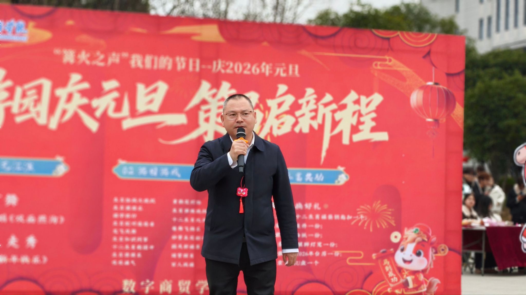活动伊始,数字商贸学院联系校领导、纪委书记刘合强作开场致辞。他深情阐释了本次游园会的传统文化底蕴,诠释马年象征力量、速度、奋斗、忠诚、自由的精神内核,寄语师生在新的一年携手奋进、共筑华章。他向全体师生送上新年祝福,宣布“游园庆元旦 策马启新程”游园活动正式开启,现场响起掌声与欢呼声。