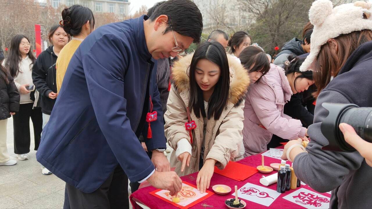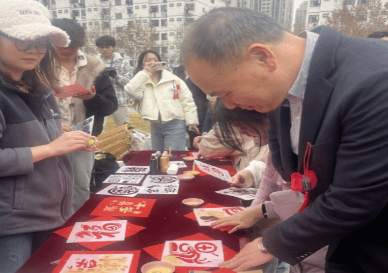 生肖绘画大挑战现场,党委书记马大奎驻足观看学生创作,不时俯身与挥毫泼墨的学子交流,称赞大家笔下的生肖形象生动鲜活;校长杨道远来到福字拓印现场,亲手拓福并赠予学生,传递亲切祝福; 生肖知识问答、生肖圈圈乐、十二生肖抱团冲等游戏场地前更是人头攒动,老师们驻足或参与或鼓劲,校园满是师生同乐的温馨。
