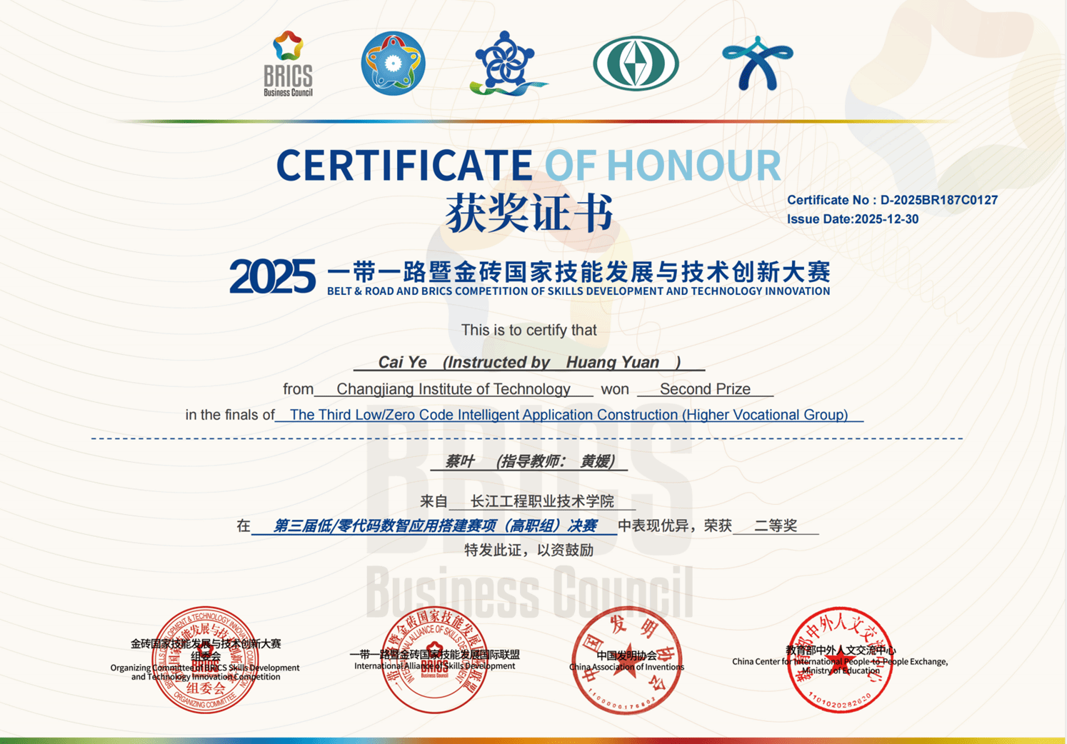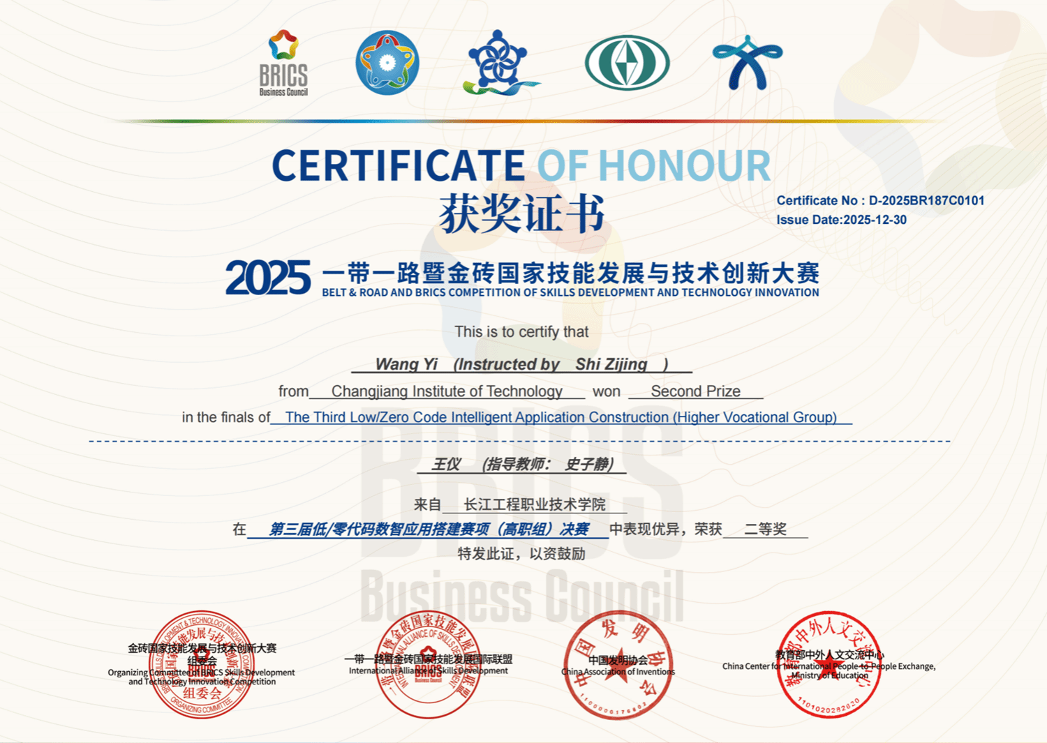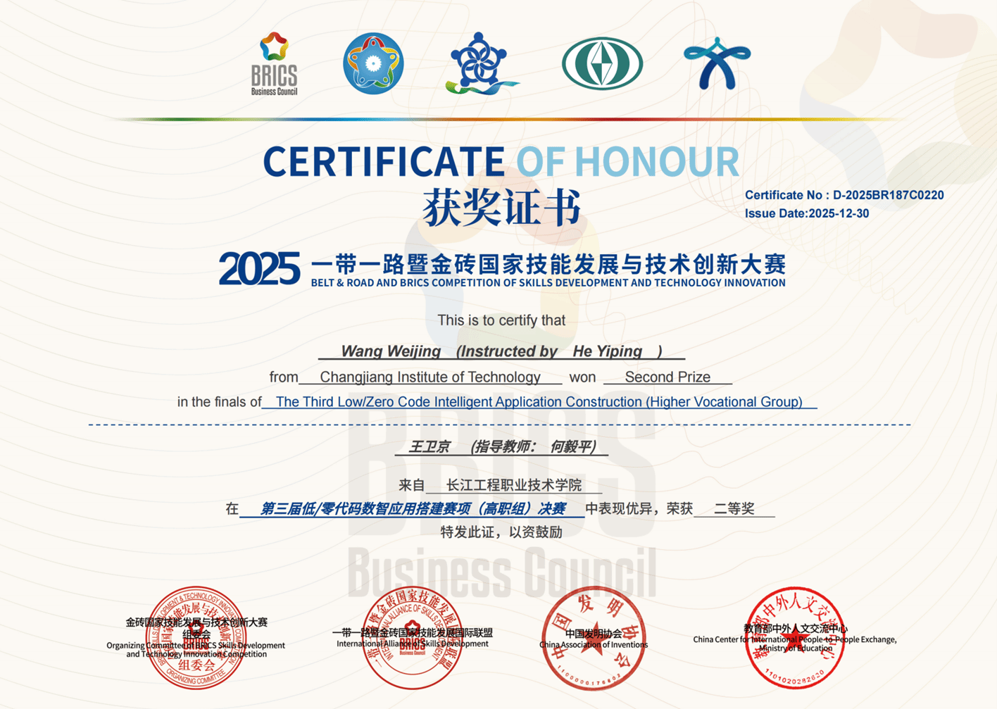 近日,2025年“一带一路”暨金砖国家技能发展与技术创新大赛之第三届低/零代码数智应用搭建赛项决赛圆满收官。人工智能学院凭借“产教融合、精准育人”的鲜明特色,在全国114所高职院校1152支队伍、37所本科院校510支队伍的激烈角逐中脱颖而出,斩获1项一等奖、4项二等奖、4项三等奖,学校获评最佳组织奖,吴琦、黄媛、何毅平、史子静4名教师荣获优秀指导教师称号,用亮眼成绩彰显了我校在人工智能与大数据领域人才培养领域的坚实根基与显著优势。