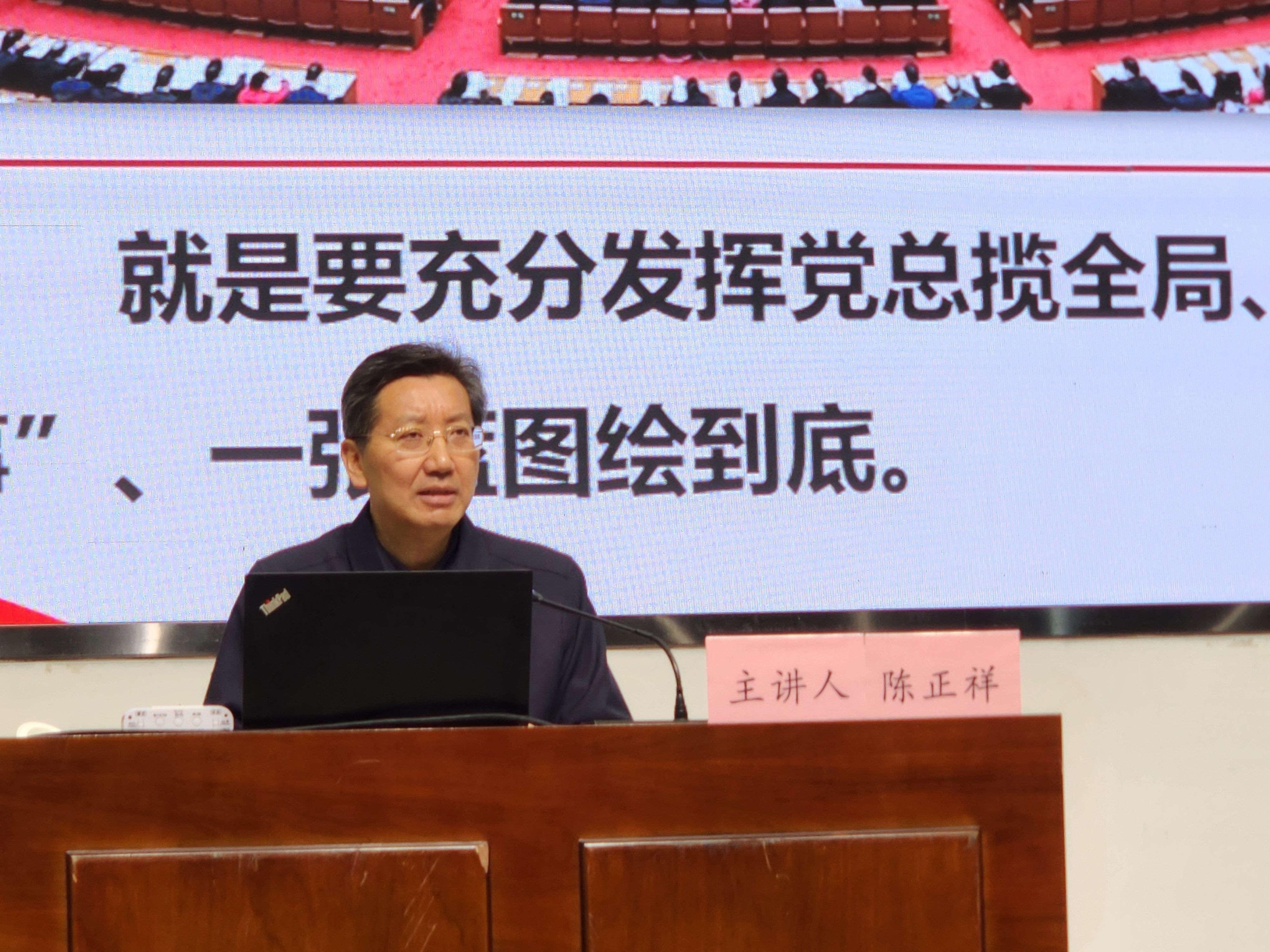陈正祥以“不懈努力 接续奋斗 奋力开创中国式现代化建设新局面”为题,围绕“为什么出发——读懂“十五五”战略考量的深意”“往哪儿迈进——把握“十五五”战略部署的核心要义”“该如何抵达——以实干实绩书写中国式现代化新篇章”三个维度,结合湖北发展实际与学校办学特色,运用详实数据和生动案例,系统阐释了全会的重大意义、核心要义与实践要求。他强调要聚焦坚持党的全面领导,推动全会精神落实落地,以高质量党建引领高质量发展。