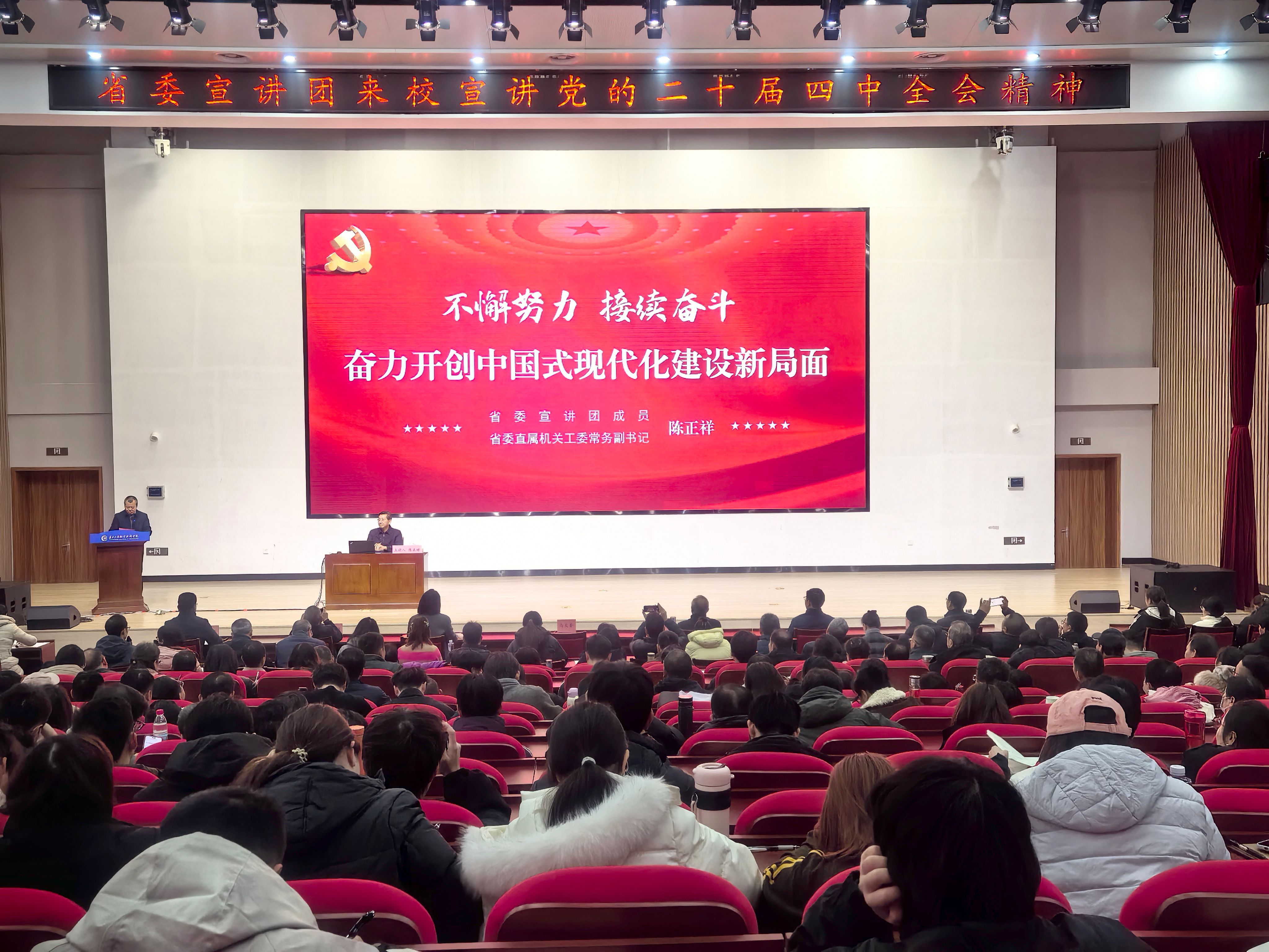 1月8日,学校举行学习贯彻党的二十届四中全会精神宣讲报告会暨党委理论学习中心组(扩大)学习会,省委宣讲团成员、省委直属机关工委常务副书记陈正祥应邀作专题宣讲报告。学校党委书记马大奎主持宣讲报告会。