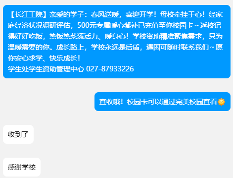 为让资助精准落地、高效暖心,学校学生资助管理中心通过严格审核、细致摸排,结合学生家庭经济状况与实际需求,精准确定帮扶对象。此次餐补500元直接充值至学生校园卡,流程简便快捷,切实缓解了学生开学期间在餐饮及日常消费上的压力,让资助举措既显实效,更有温度。