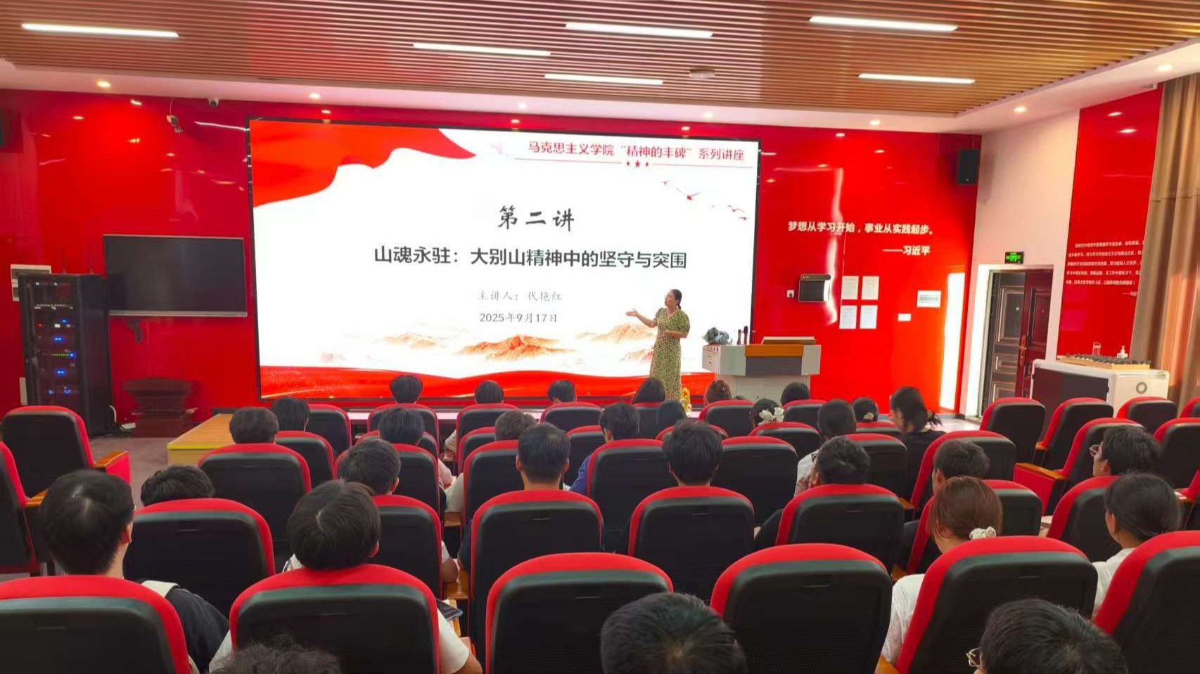为深入学习贯彻习近平总书记考察湖北时的重要讲话精神,“大力弘扬大别山精神、抗洪精神、抗疫精神,广泛践行社会主义核心价值观”,让“大别山精神”进一步走进我校师生的内心,9月17日下午在我校思政课虚拟仿真体验教学中心,马克思主义学院“精神丰碑”系列专题讲座第二讲开讲。学院教师代艳红以《山魂永驻:大别山精神中的坚守与突围》为题,开展了思政专题讲座。我校2024级部分学生代表参加了讲座。