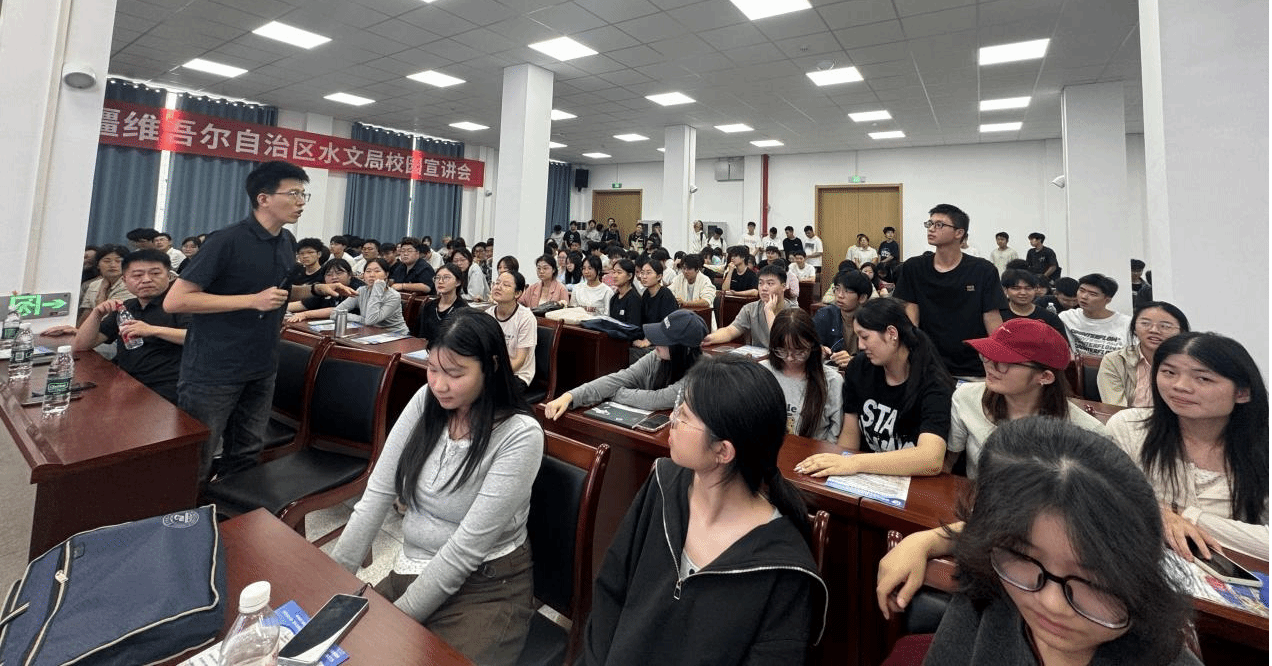 宣讲会上,杨西泽处长通过播放专题纪录片,系统展示了新疆水文局的发展历程、流域监测网络布局,以及在防汛减灾、水资源保护等方面的核心职能与重要成就。片中呈现的塔里木河、艾丁湖等自然地理景观,以及丝绸之路经济带核心区建设等内容,生动展现了新疆水文的战略意义和发展潜力。水文事业高质量发展需要多元化人才,不论是善于野外勘查的“江河探险家”,还是精于数据建模的“智慧工程师”,都能在此找到施展才华的舞台。