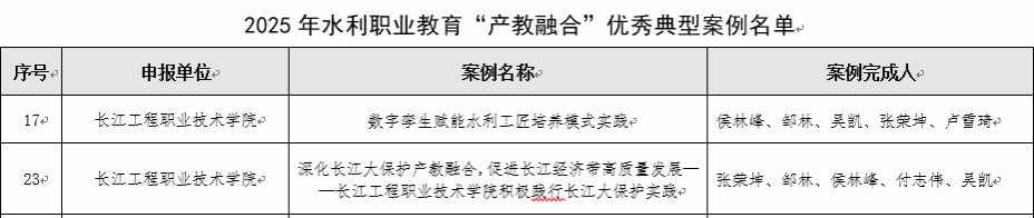 我校申报的《数字孪生赋能水利工匠培养模式实践》《深化长江大保护产教融合,促进长江经济带高质量发展——长江工程职业技术学院积极践行长江大保护实践》两项案例成功入选,进一步巩固了学校在水利职业教育产教融合领域的领先地位,为行业人才培养提供了可复制、可推广的 “长江工院方案”。