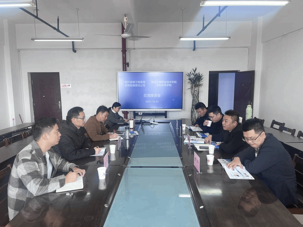10月22日上午,四川金朋工程管理咨询有限责任公司人力资源总监丁黎明、副总监曾伟、技术总监王超、技术副总监杨忠平一行来校交流校企合作事宜,就共建“金朋班”订单班事宜与水利水电学院开展合作洽谈并举行签约仪式。学院党总支书记徐茂林、副书记罗勇、校企合作负责人陈萌老师及辅导员向裕老师共同参会。