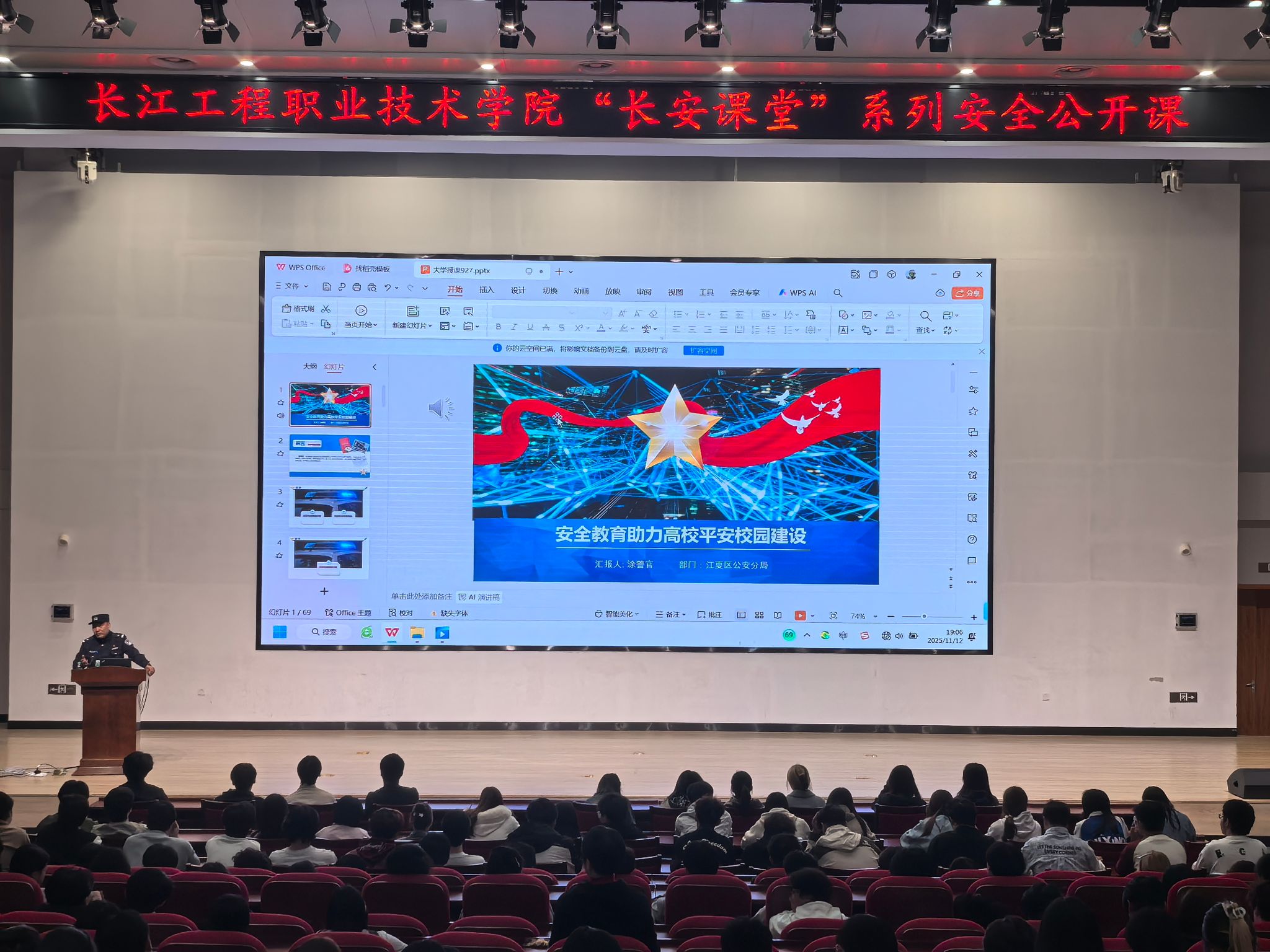 为了增强我校学生防骗识骗和反诈能力,11月12日,保卫处、人工智能学院联合举办的“长安课堂”系列安全公开课在问渠厅正式开讲,党委保卫部部长赵志杰、人工智能学院党总支书记汪吉平、学工秘书陈雄以及全体辅导员参加公开课。