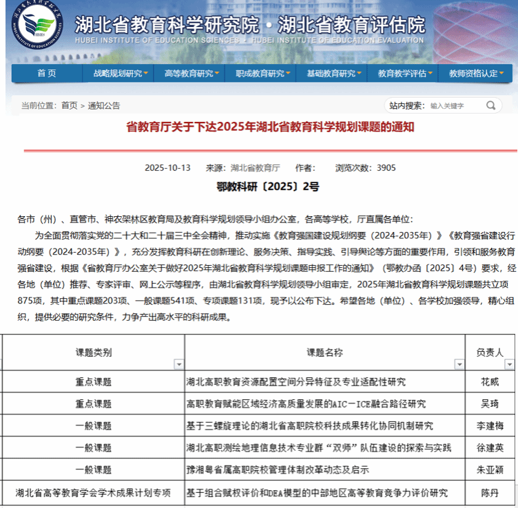 2025-10-1510月13日,湖北省教育厅公布了2025年湖北省教育科学规划课题立项结果,我校立项重点课题2项、一般课题3项、专项课题1项,立项数首次突破6项,这也是我校文科继“2023年省教育厅哲社研究项目立项数(7项)居全省第四”后取得的又一佳绩。为提升重要课题的立项成功率,促进科研工作上台阶,近年来我校科研处、教师工作部加大投入力度,注重开展常态化科研培训。2022年启动青年科研人才培养计划。2024年、2025年分别委托武汉大学、湖南大学举办科研专题培训班。...