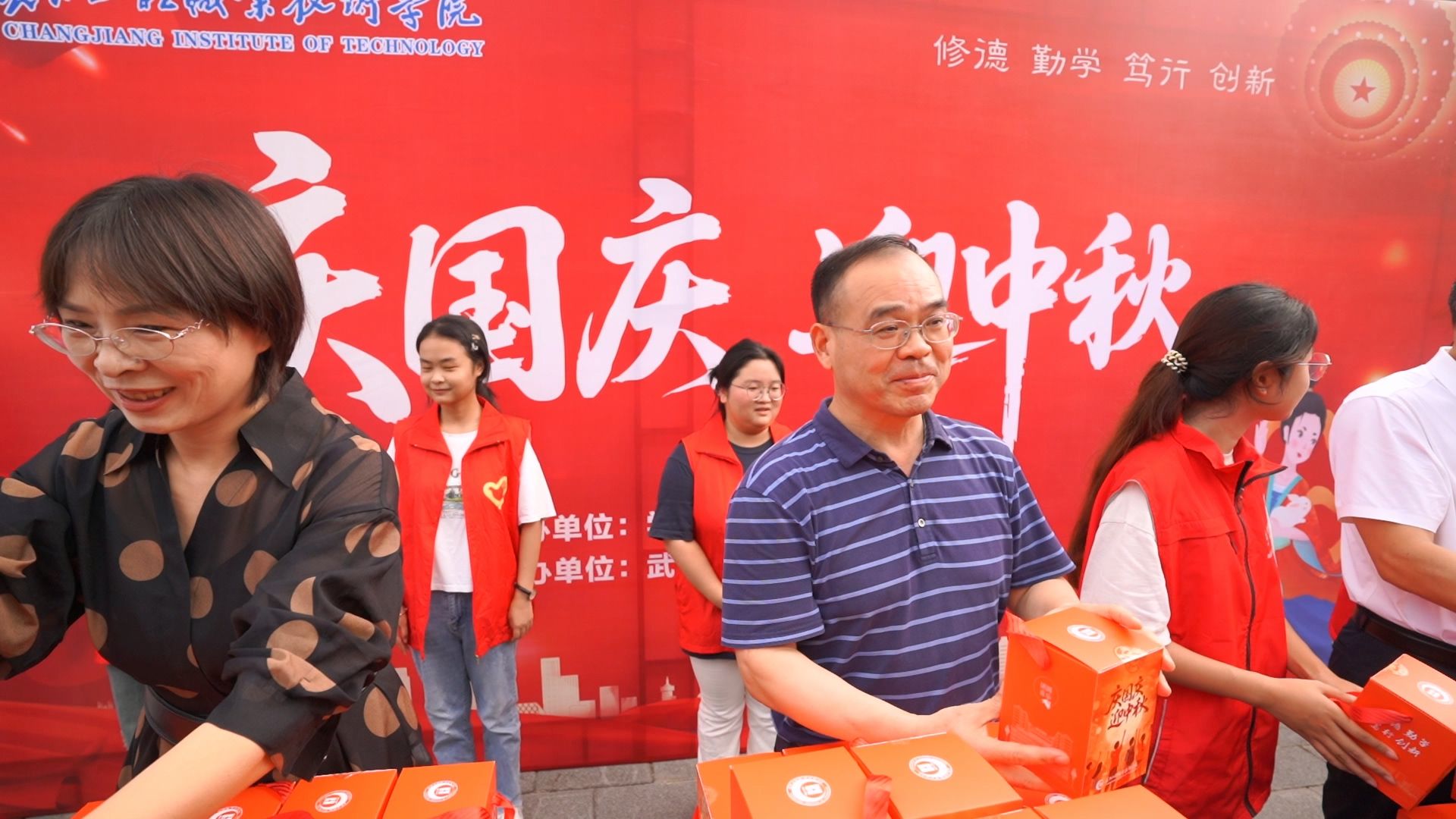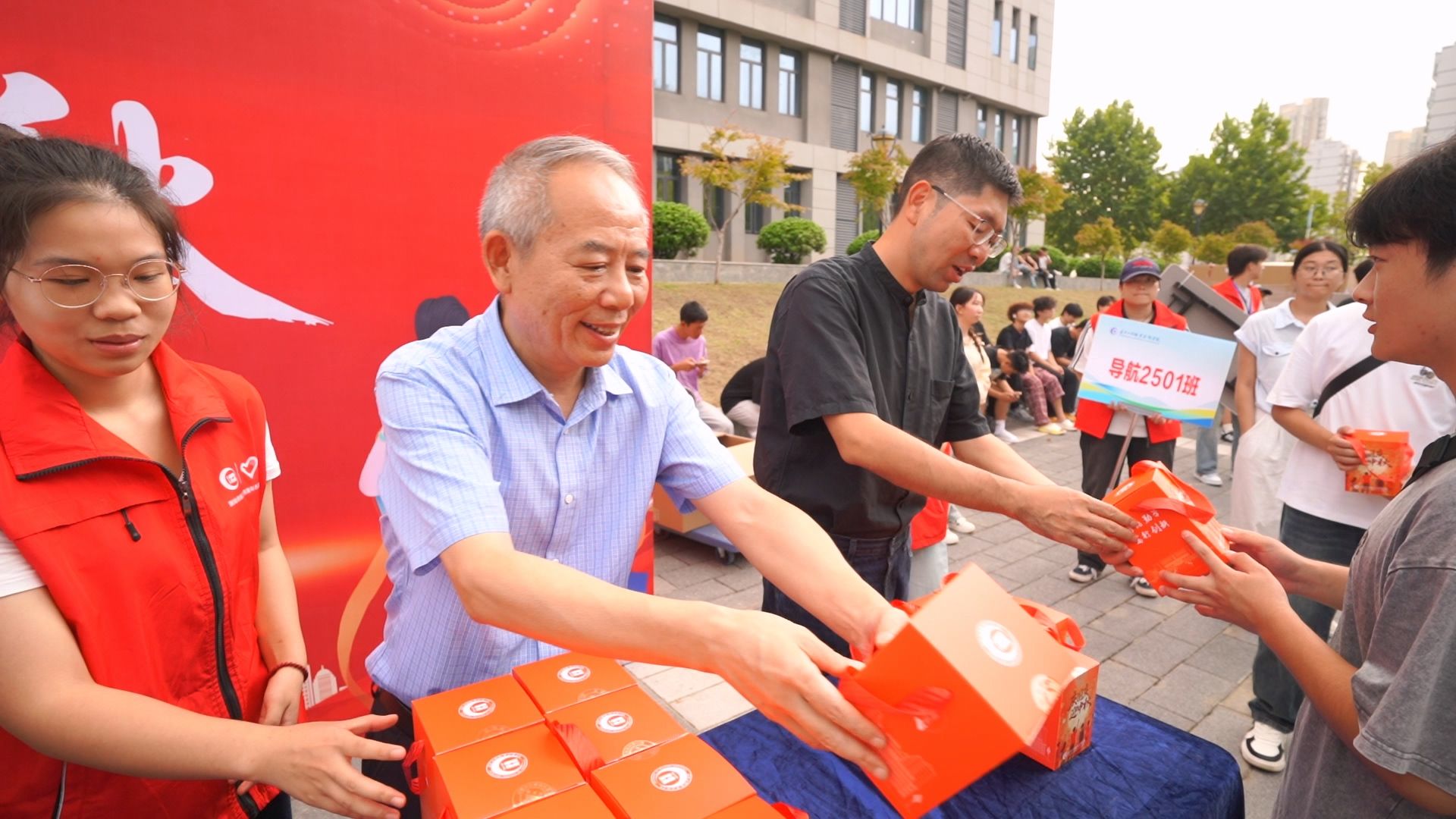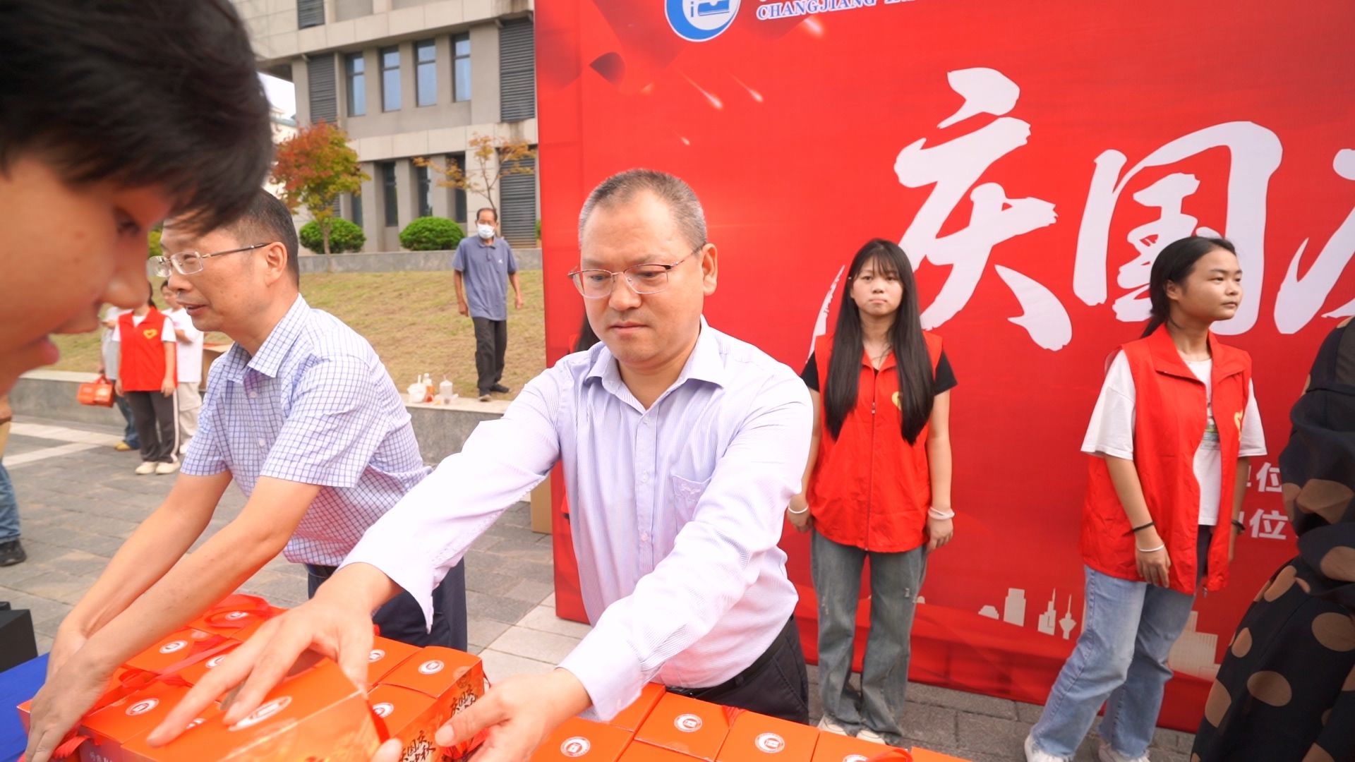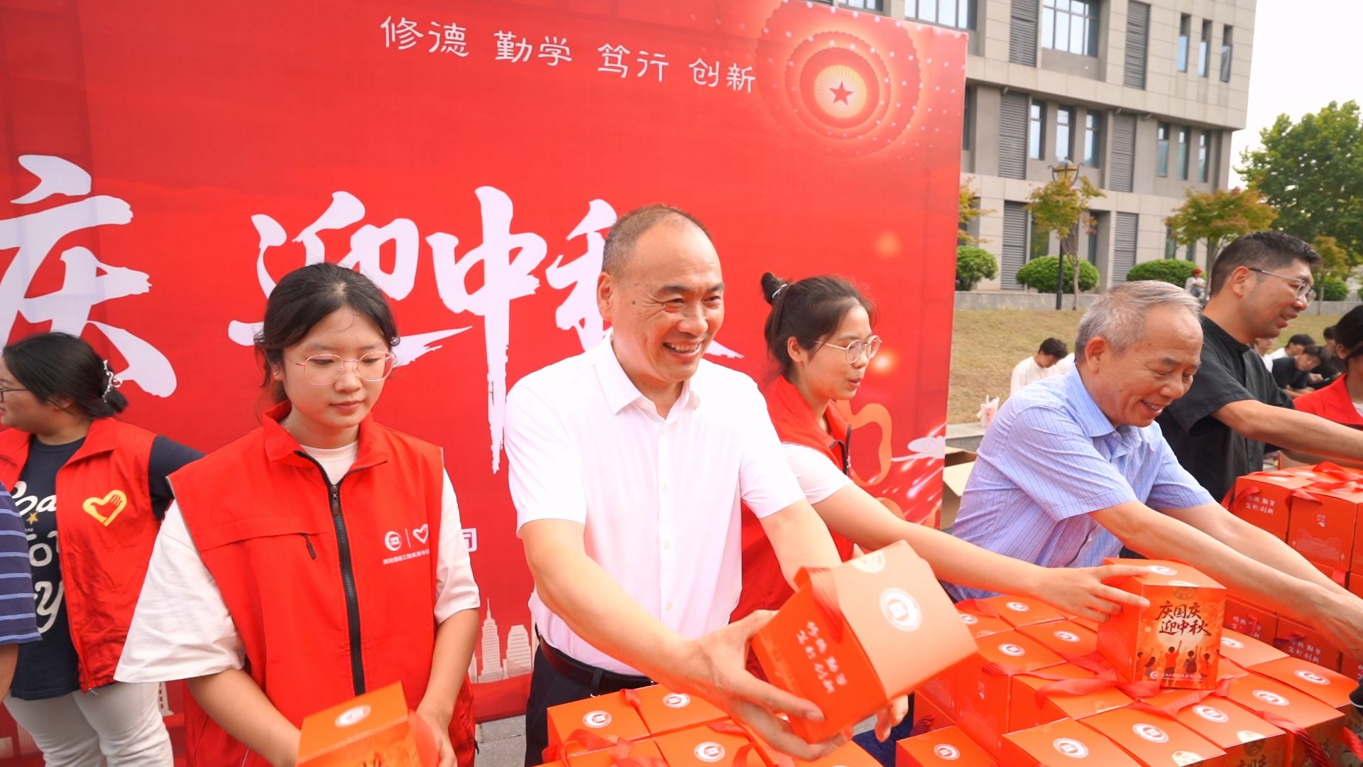 中秋国庆双节来临之际,西江楼北广场暖意融融。全体校领导走进学生社区,为全体在校学生发放节日大礼包,传递学校的关怀与祝福。