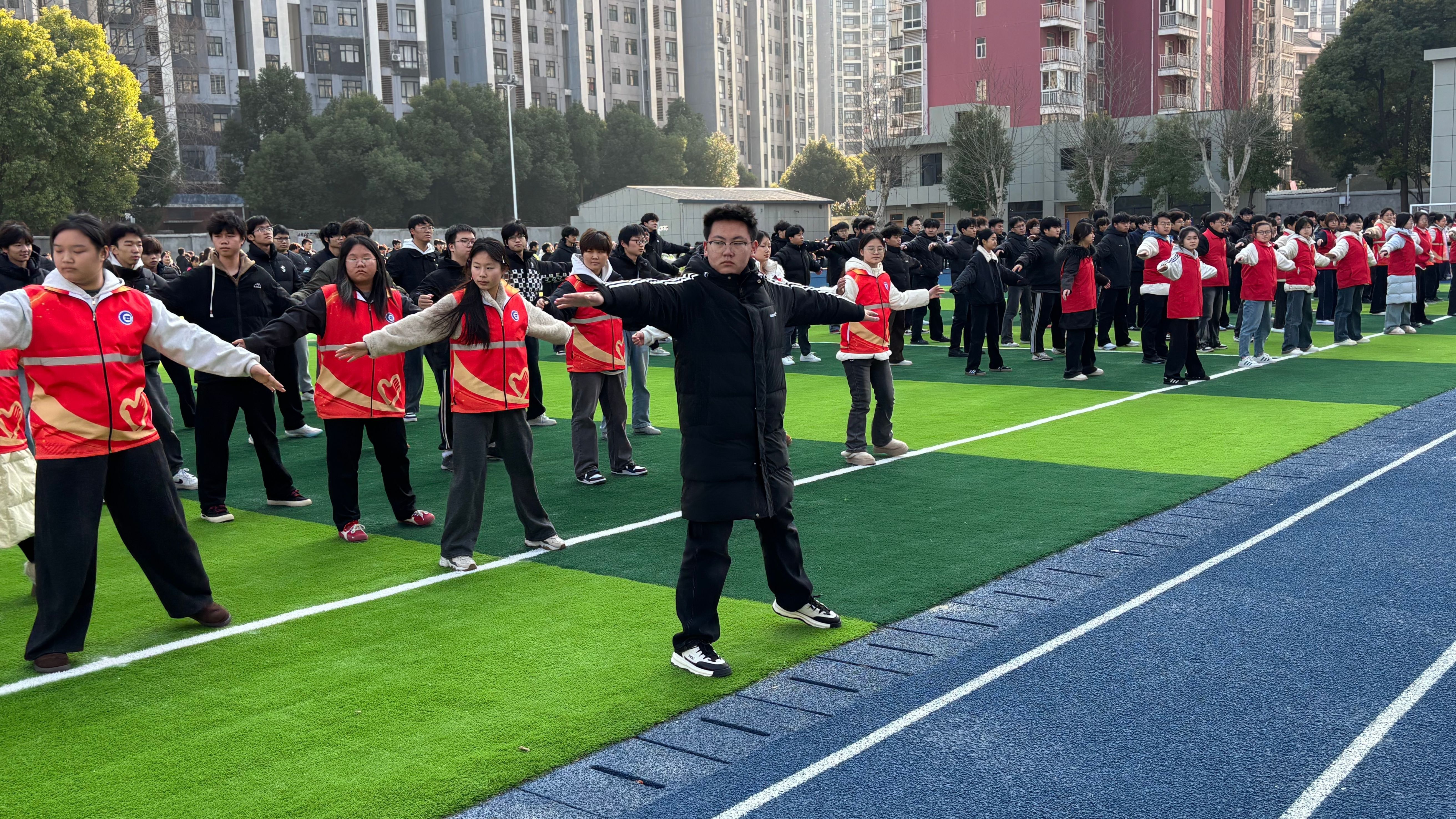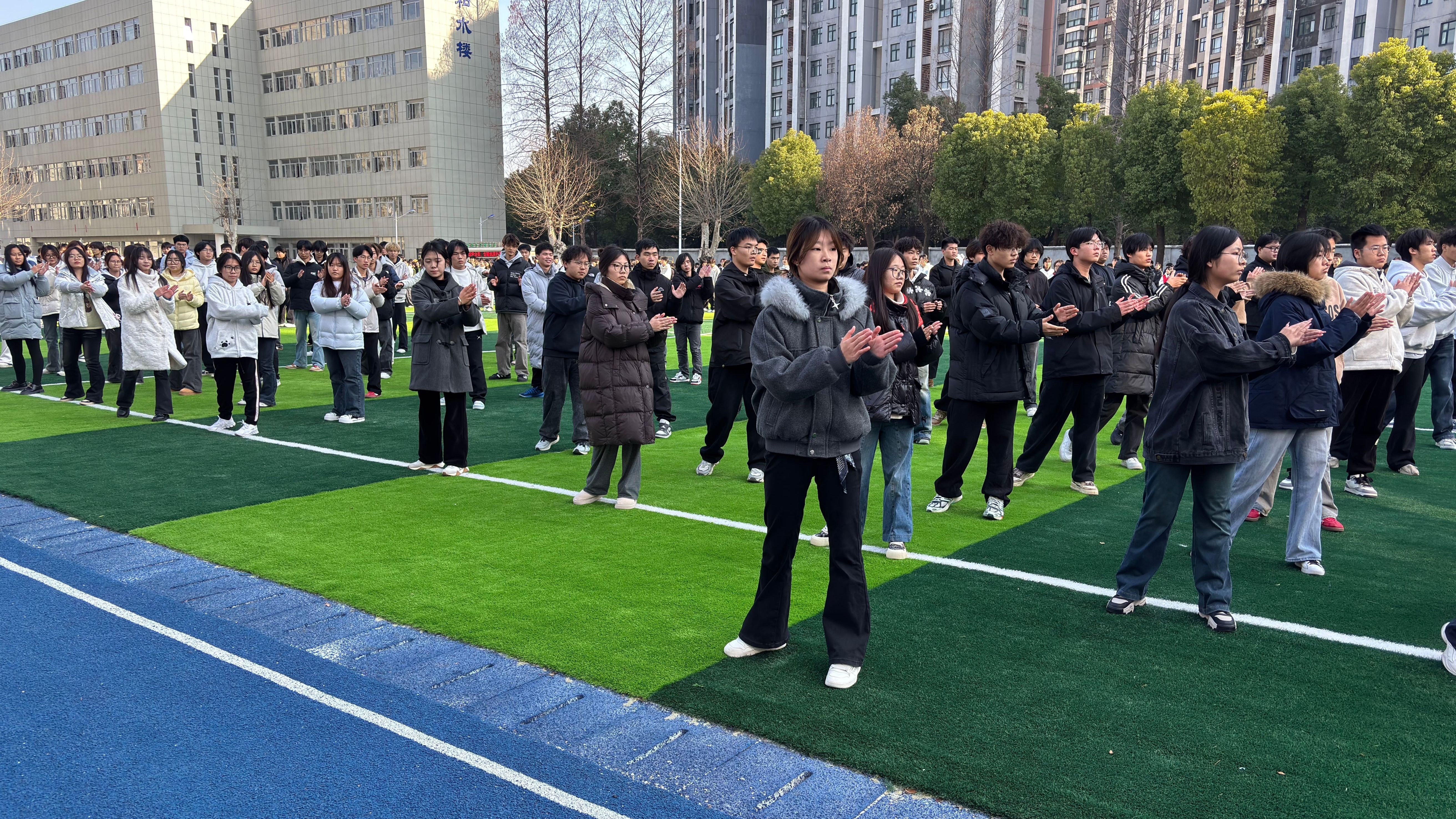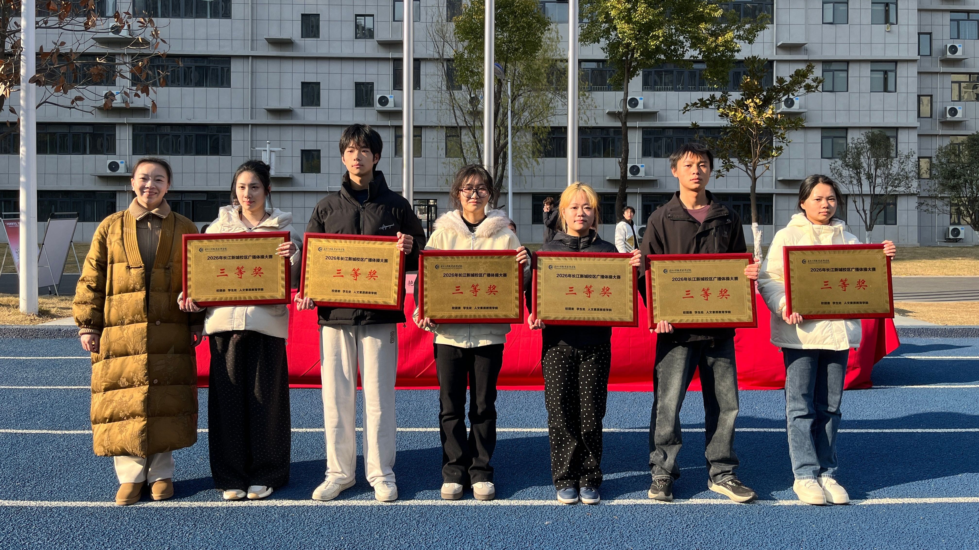 1月7日,由校团委、学生处、人文素质教育学院联合主办,校学生会承办的2026年长江新城校区广播体操大赛在弘新运动场隆重举行。党委委员、副校长、新城校区管委会主任卢俊,党委学生工作部、团委、人文素质教育学院主要负责人,校区管委会成员及教师代表前往现场,水利水电学院、北斗技术学院共计19个班级的学子们同台竞技,以整齐的动作、昂扬的姿态展现青春风采。