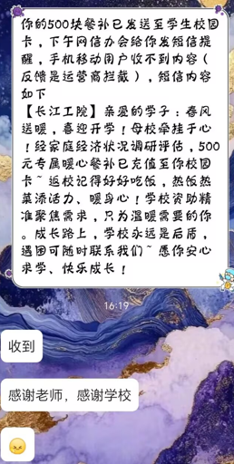 为让资助精准落地、高效暖心,学校学生资助管理中心通过严格审核、细致摸排,结合学生家庭经济状况与实际需求,精准确定79名帮扶对象。此次餐补500元直接充值至学生校园卡,流程简便快捷,切实缓解了学生开学期间在餐饮及日常消费上的压力,让资助举措既显实效,更有温度。