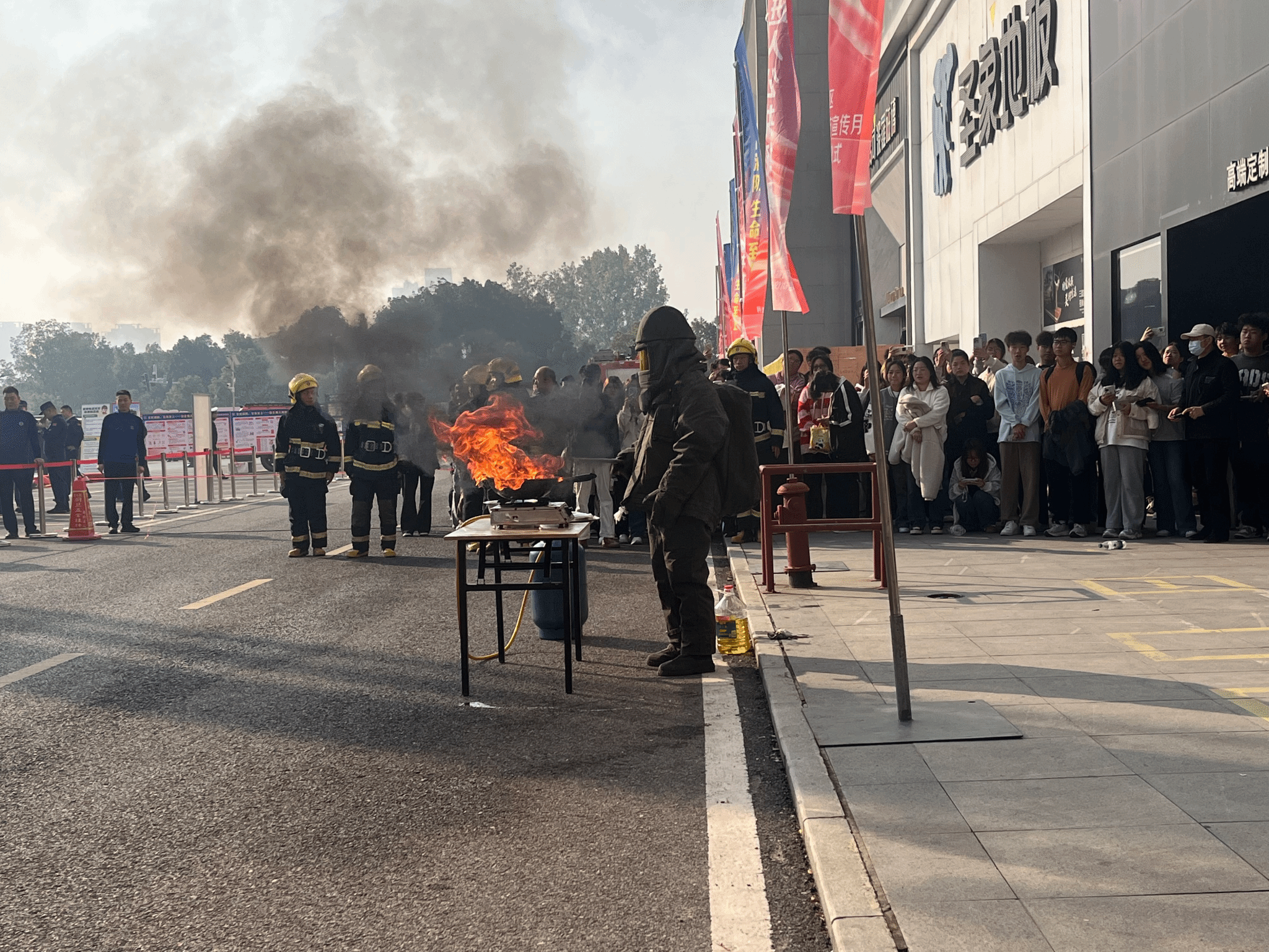 现场分设了消防知识展板、消防装备展示、疏散逃生演练、灭火实操、有奖知识问答等区域。消防员现场精准还原厨房油锅起火、电气设备起火现场,并详细讲解了各类火灾的灭火方式,每一个场景都让在场师生直观感受到“小隐患”酿成“大事故”的严峻风险。