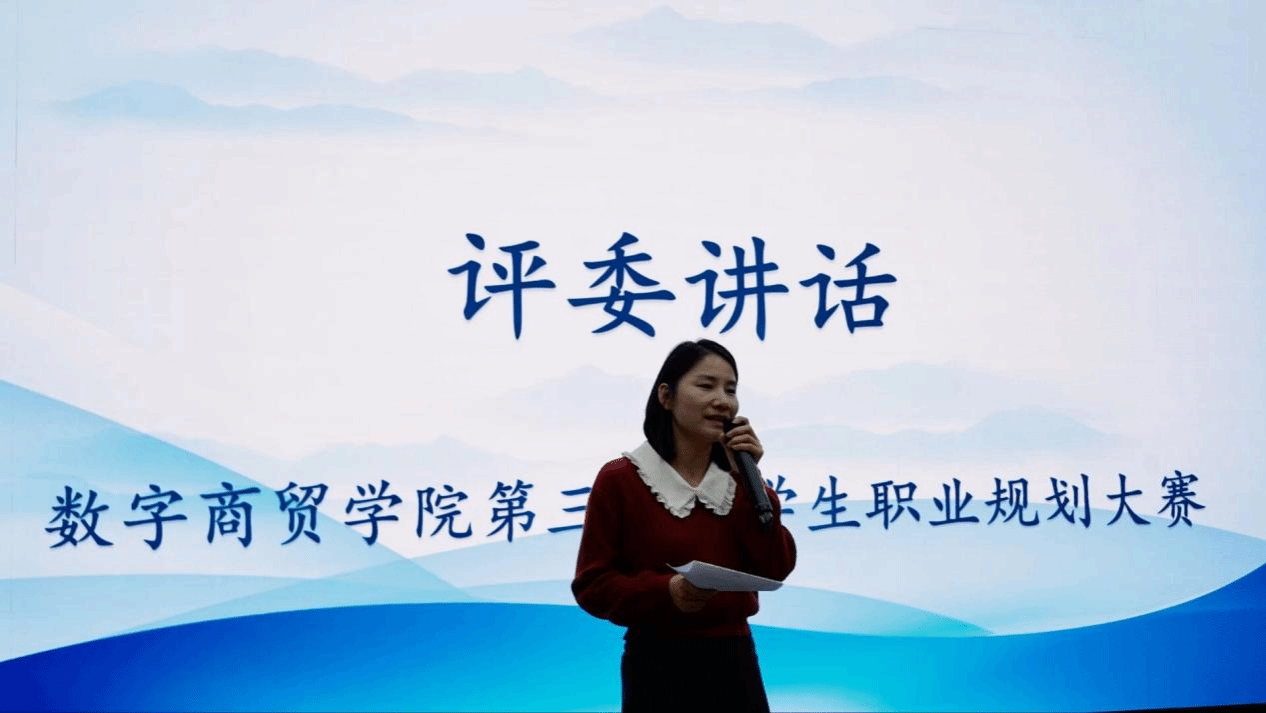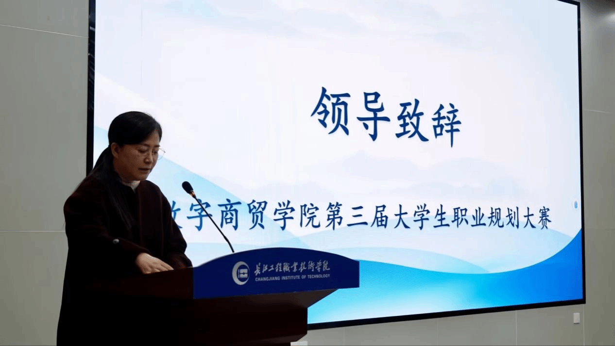 贾书媛致辞,她表示职业规划是学生成长成才的重要指引,关乎个人发展与社会需求的精准对接。学院始终高度重视学生职业发展教育,希望通过大赛为学生搭建展示自我、交流学习的平台,鼓励同学们立足专业特色,锚定职业目标,在规划中明确方向,在实践中锤炼本领,为未来职业发展筑牢根基。