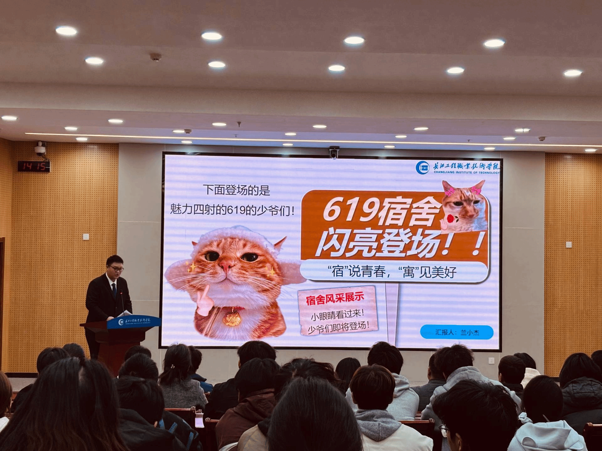 作为学生社区的核心单元,宿舍是学生日常生活、学习交流的重要场所,也是社区综合管理与育人功能落地的关键载体。本次评选严格遵循“学院筛选、择优推荐、校级评审”流程,前期经各二级学院层层把关、精准遴选,文化大道校区16个宿舍、长江新城校区6个宿舍脱颖而出,晋级校级汇报展示环节。汇报现场,各宿舍代表通过精心制作的 PPT 与生动讲解,从精神风貌、卫生管理、文化氛围、学风建设、成员凝聚力等维度,全面展示了宿舍在自主管理、互助共建等方面的特色做法--有的打造学习型宿舍,依托社区研学资源开展互助答疑;有的构建文化型宿舍,融入专业特色与青春元素营造育人氛围;有的践行服务型宿舍,主动参与社区志愿服务与安全巡查,充分展现了我校学子在“一站式”社区建设中的主体作用与良好精神风貌。