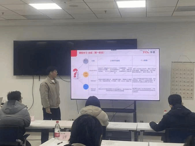 本次答辩会是现场工程师班学员从理论学习转向岗位实践的关键节点,旨在检验学员专业技能与通用能力的成长实效。答辩现场,来自面板厂、模组厂、印刷OLED中心的学员们,结合各自岗位实践案例,系统阐述了在设备操作、工艺优化、问题排查等方面的技能提升,以及沟通协作、复盘总结等职业素养的进步。