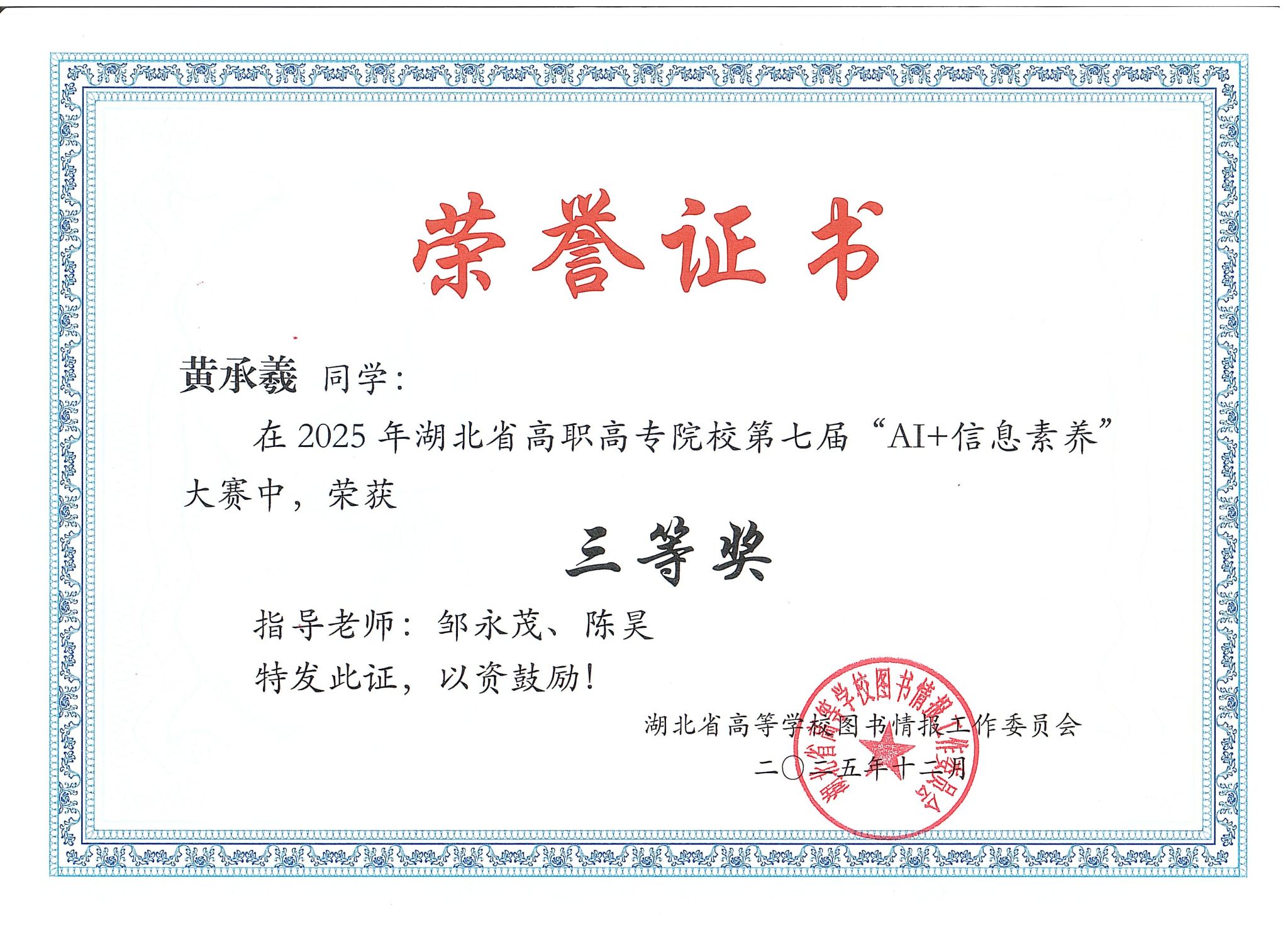 近日,湖北省高职高专院校第七届“AI+信息素养”大赛圆满落幕。我校学生在本次大赛中表现优异,凭借扎实的信息素养基础、出色的团队协作能力以及对人工智能技术的创新应用,最终荣获大赛“优秀组织奖”,展现了学校在深化教育教学改革、着力培养学生信息素养与智能化应用能力方面取得的显著成效。