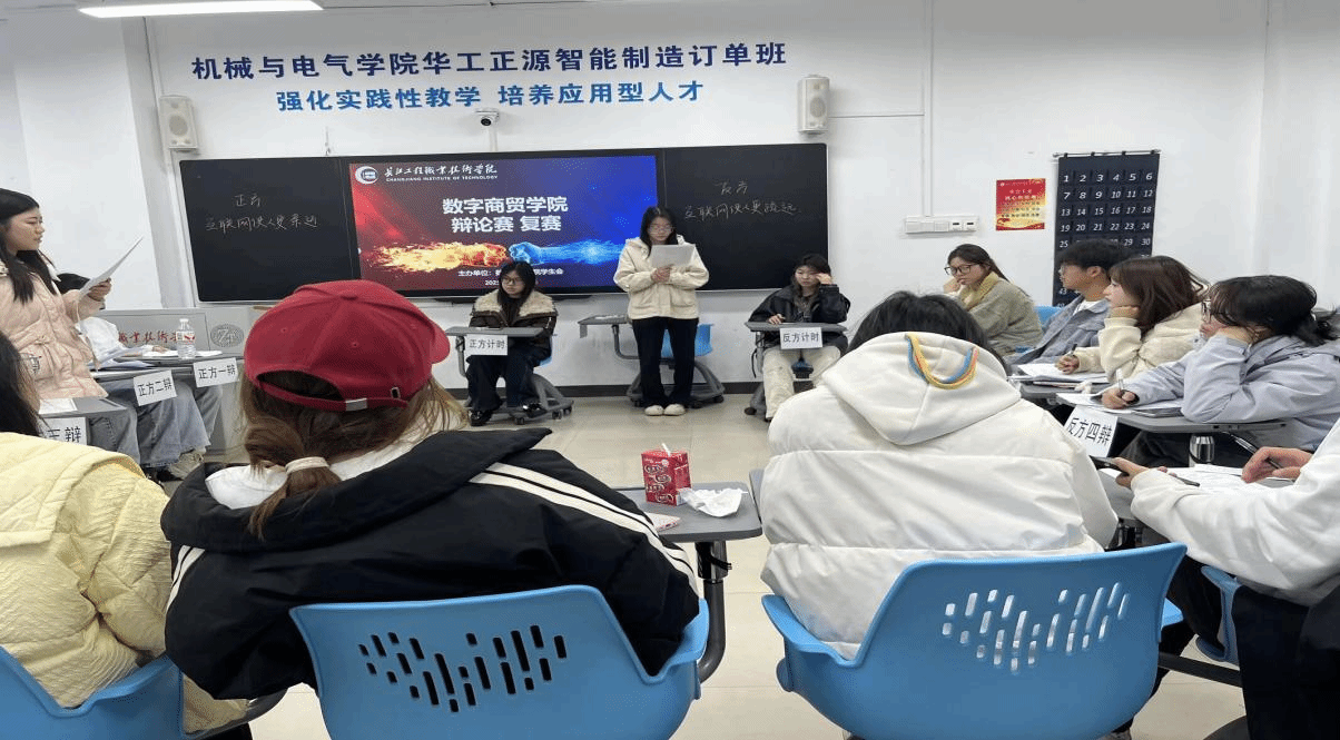 为进一步浓厚校园学习氛围,锤炼青年学子思辨能力,引导学生树立积极向上的人生态度,12月24日晚,数字商贸学院学生会于长江楼惟勤厅开展学风建设月系列活动之辩论赛决赛。学院党总支副书记熊晓艳、学生党支部组织委员翟睿、分团委书记张智颖、学生会指导老师钱翠翠担任评委。