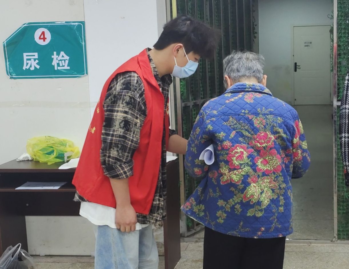 清晨七点半,志愿者们准时抵达活动现场,迅速熟悉服务流程,投入秩序引导、高龄居民接待等保障工作。本次社区健康服务设置抽血检测、体重测量、B超、心电图、中医体质辨识五大区域,面向社区老年群体提供免费检查。针对现场高龄老人居多的情况,志愿者主动搀扶引导,为行动不便的长者开辟绿色通道,全程陪同完成各项检查,并协助做好信息登记,以细致服务化解老人们的紧张与不便。